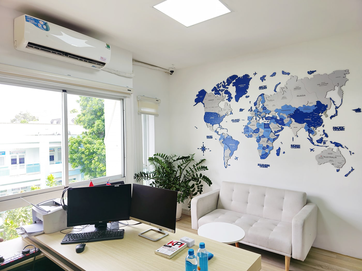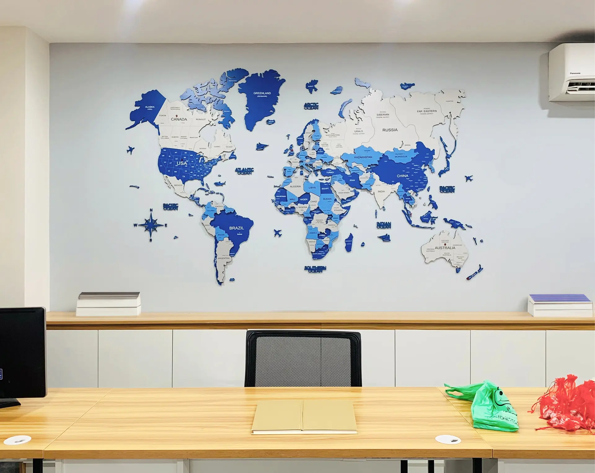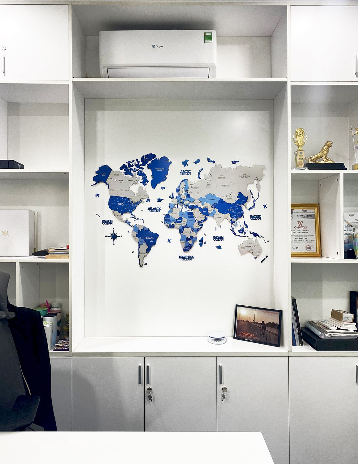 Một bản đồ thế giới màu xanh dương trong phòng làm việc không chỉ để trang trí mà còn giúp kích thích tư duy, tạo cảm hứng khám phá và sáng tạo.