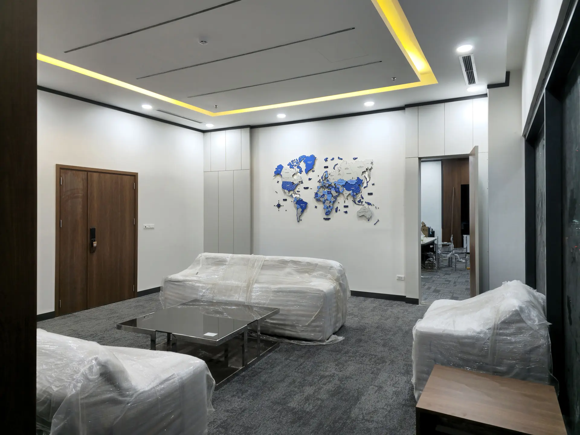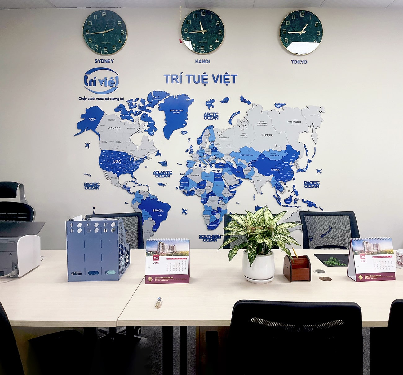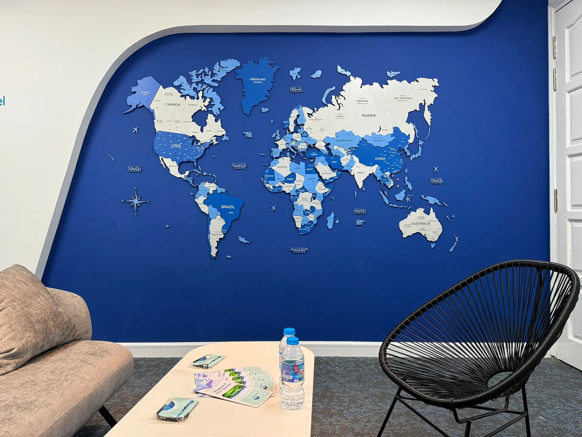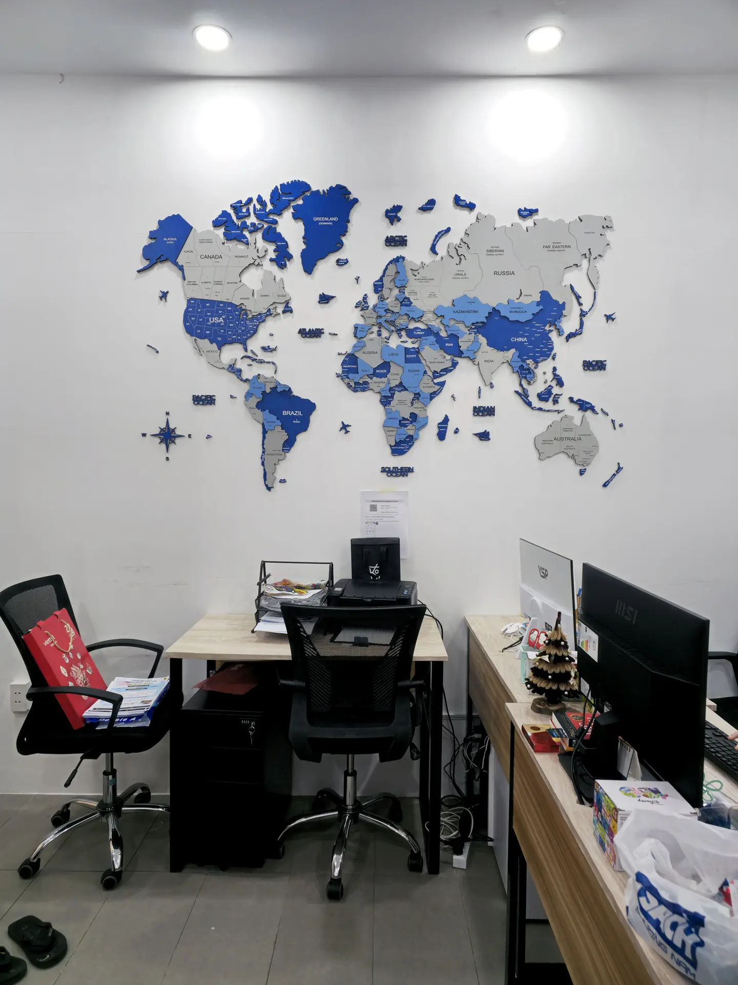 Một bản đồ thế giới màu xanh dương trong phòng làm việc không chỉ để trang trí mà còn giúp kích thích tư duy, tạo cảm hứng khám phá và sáng tạo.